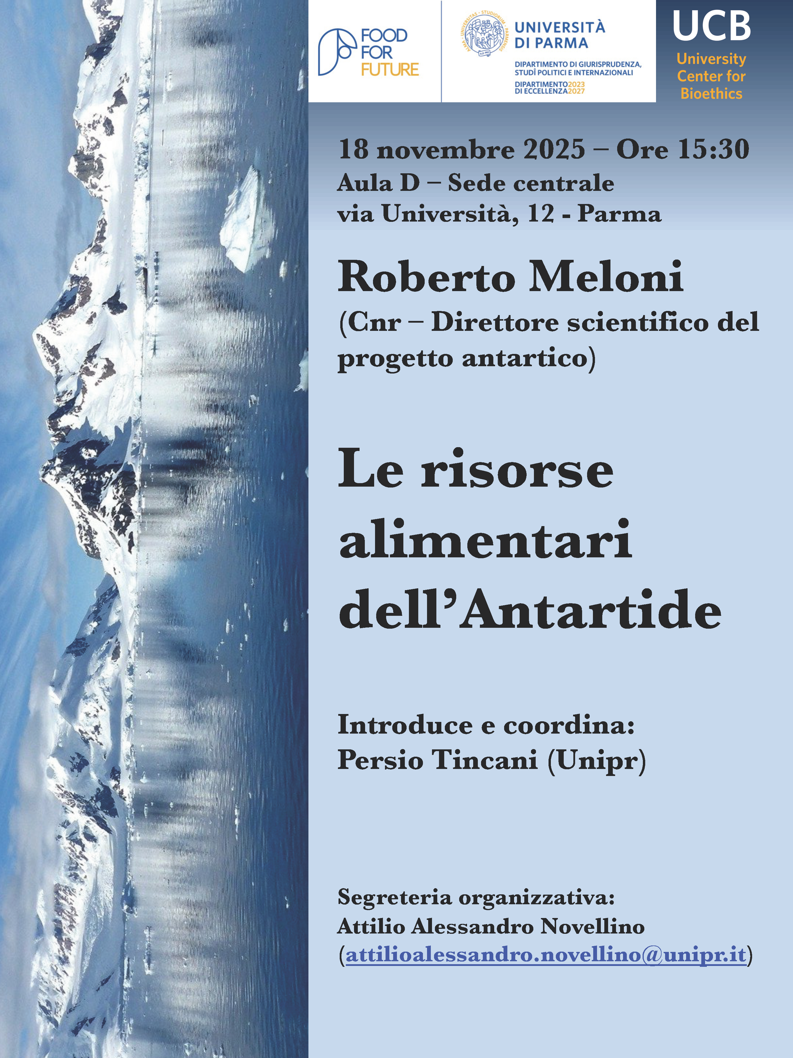 Martedì 18 novembre 2025, alle ore 15:30 (Aula D, sede centrale), Roberto Meloni (già direttore scientifico del progetto antartico del Cnr) terrà una conferenza sulle risorse alimentari dell’Antartide e sul loro sfruttamento, mostrando e discutendo molto materiale fotografico inedito raccolto durante le numerose spedizioni alle quali ha partecipato. La conferenza si inserisce nell’ambito delle iniziative Food For Future - F4F del Dipartimento d’eccellenza.