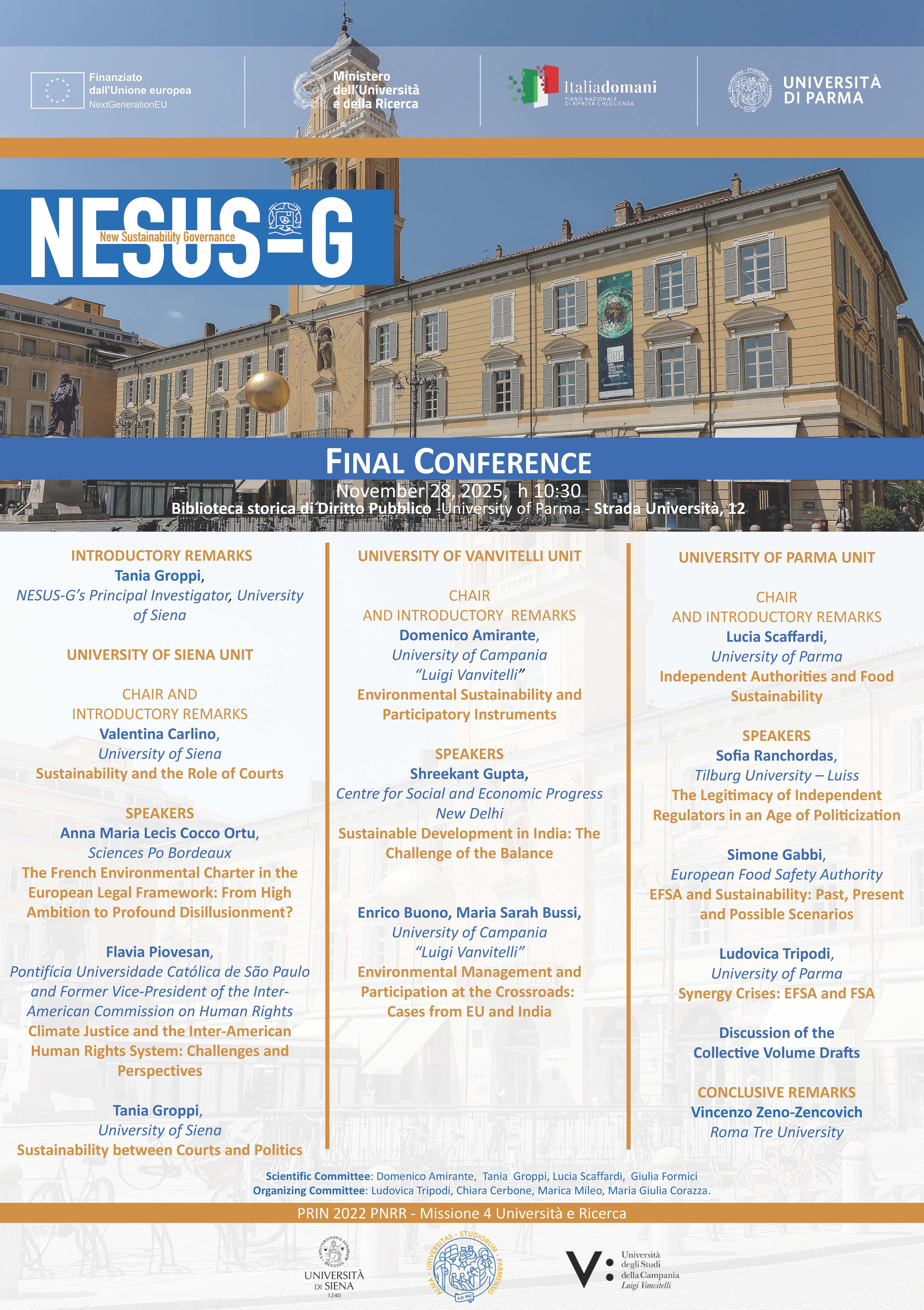 Venerdì 28 novembre p.v. dalle ore 10:30, presso la Biblioteca storica di Diritto Pubblico, si terrà il Convegno finale del progetto PRIN PNRR New Sustainability Governance (NESUS-G) di cui l’Università di Parma è parte con un’unità di ricerca da me coordinata. L’incontro si articolerà in tre sessioni, durante le quali ciascuna delle tre unità partecipanti relazionerà sui temi della propria ricerca.