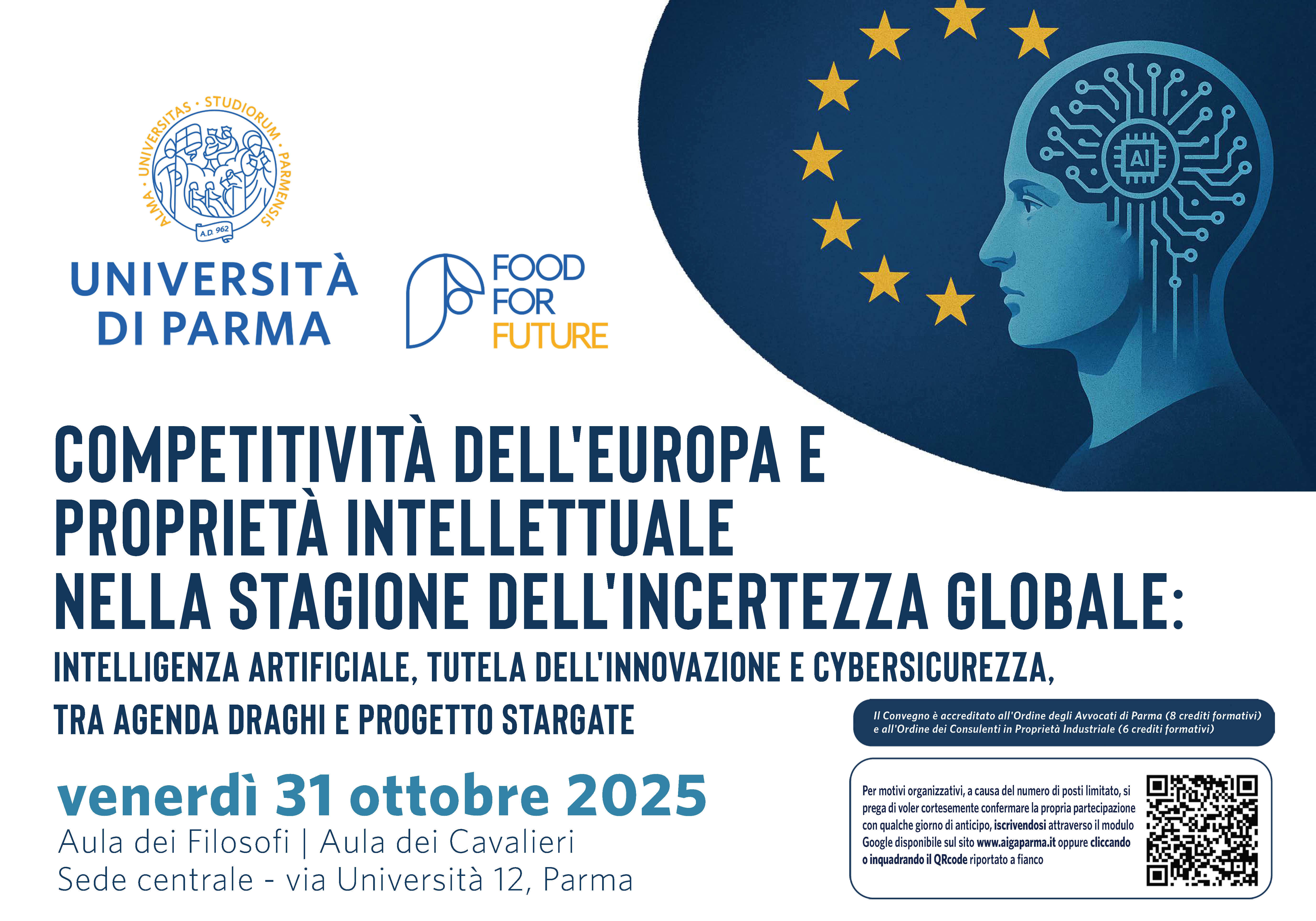 Venerdì 31 ottobre dalle 9:30 alle 18:30, presso le aule Filosofi e Cavalieri dell'Università di Parma, si terrà il convegno annuale di Diritto industriale, che quest'anno sarà intitotato "Competitività dell'Europa e Proprietà Intellettuale nella stagione dell'incertezza globale: intelligenza artificiale, tutela dell'innovazione e cybersicurezza, tra agenda Draghi e Progetto Stargate" e toccherà i temi di maggior rilievo nell'ambito tecnologico, nonché le maggiori novità nell'ambito del diritto in Europa, a partire dall'introduzione dell'AI Act, fino ai Computer Implemented Inventions e al nuovo regolamento sul Design.