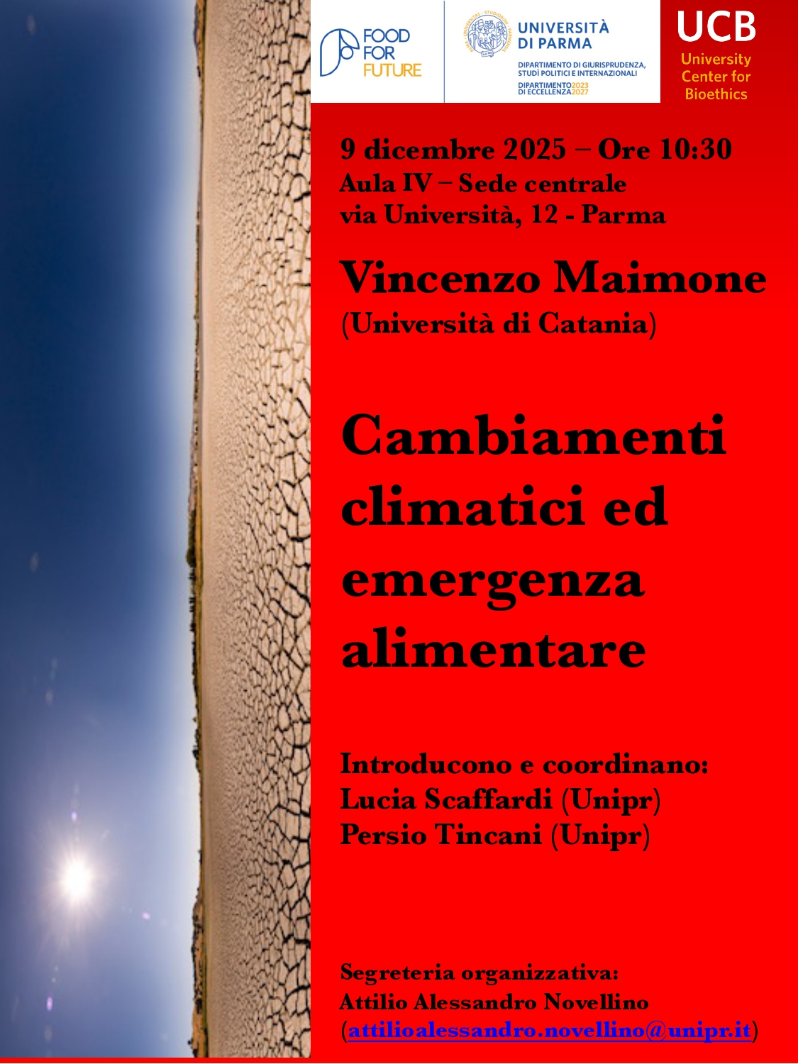 Martedì 9 dicembre 2025, alle ore 10.30, presso l'Aula IV Sede Centrale (Via Università 12), si terrà il Seminario dal titolo: "Cambiamenti climatici ed emergenza alimentare" tenuto dal Prof. Vincenzo Maimone dell’Università di Catania.